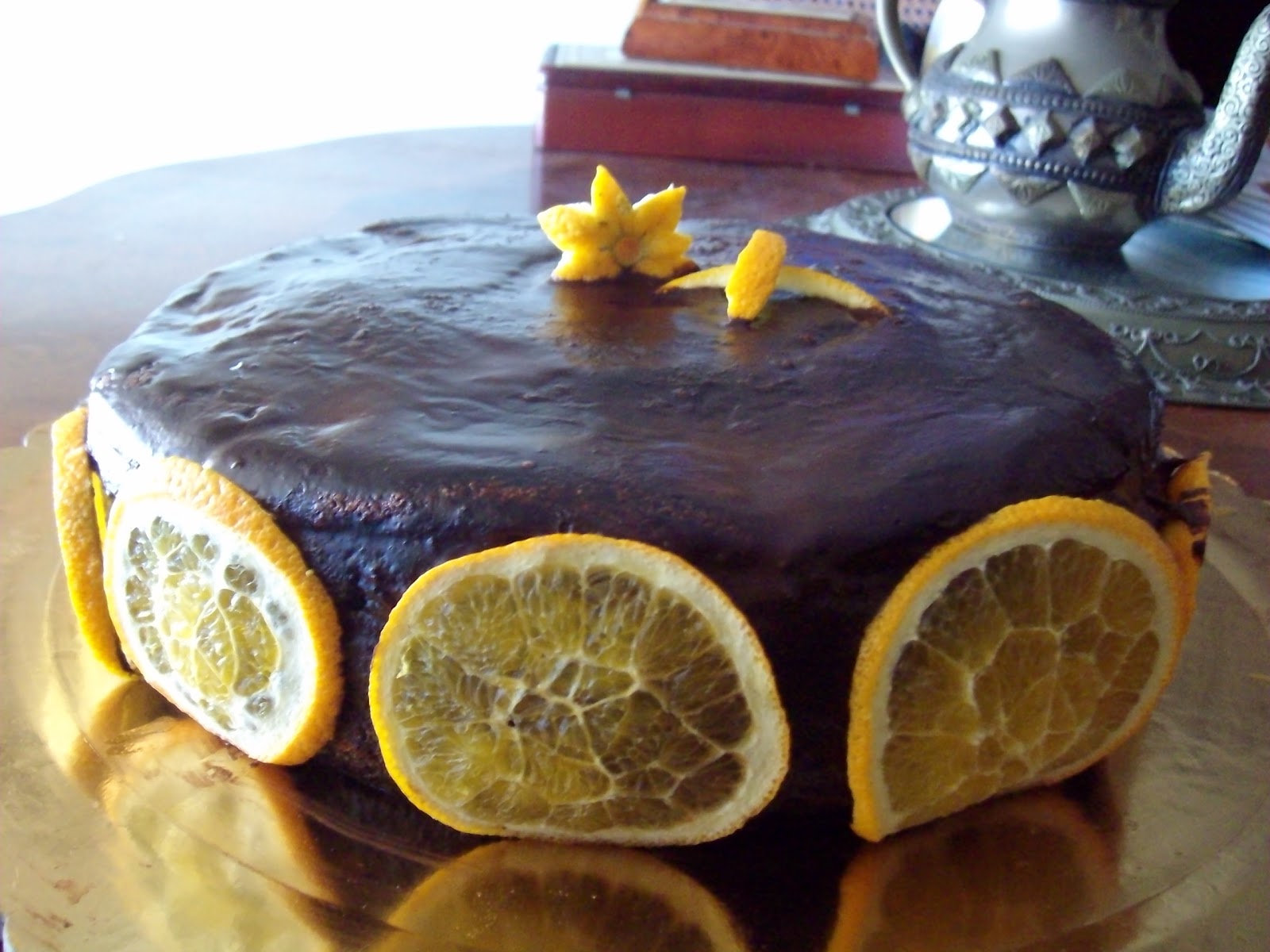 Preparate la glassa per la copertura facendo sciogliere la colla di pesce in un po’ d’ acqua per circa 10 minuti intanto cuocete in un pentolino per dieci minuti mescolando il cacao con l’ acqua, lo zucchero e la panna. Strizzate la colla di pesce aggiungetela al composto e fate addensare.Togliete la glassa dal fuoco e fatela raffreddare. Una volta fredda versatela sulla torta ricoprendola completamente. Aggiungete sui bordi della torta delle fette sottili di arancia per guarnire. Mamma mia! Mi e’ venuto il gomito del tennista!!! Meglio consolarsi con una fetta di torta. Ciao Ciao!!